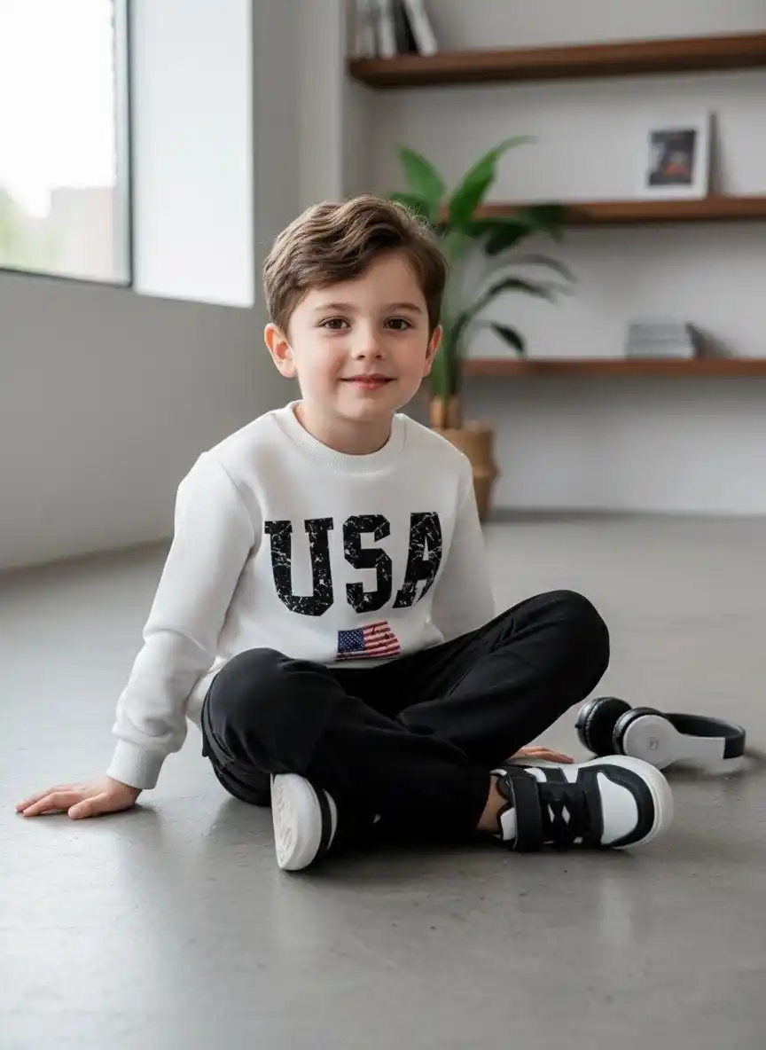 USA White Printed T-Shirt and Black Color Joggeres Set for Boys